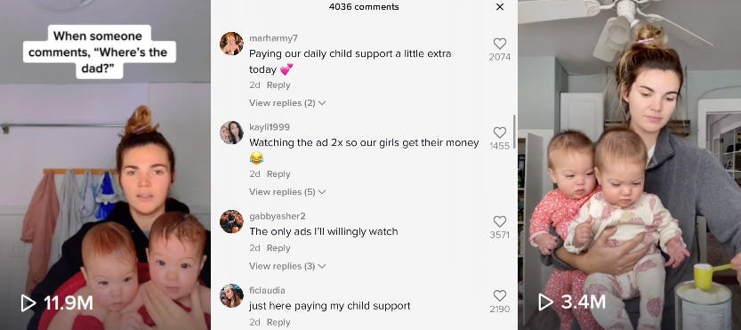 3.) Maia Knight (@maiaknight) has had a meteoric rise on TikTok, joining the app in June and growing to 6M followers today. She’s a single mom of twins named Scout and Violet (somehow she holds both of them at once?), and her videos feature their adventures. You can’t help but root for her - she’s already built an incredibly engaged community of people who feel like part of the family + even cheer for her ads!