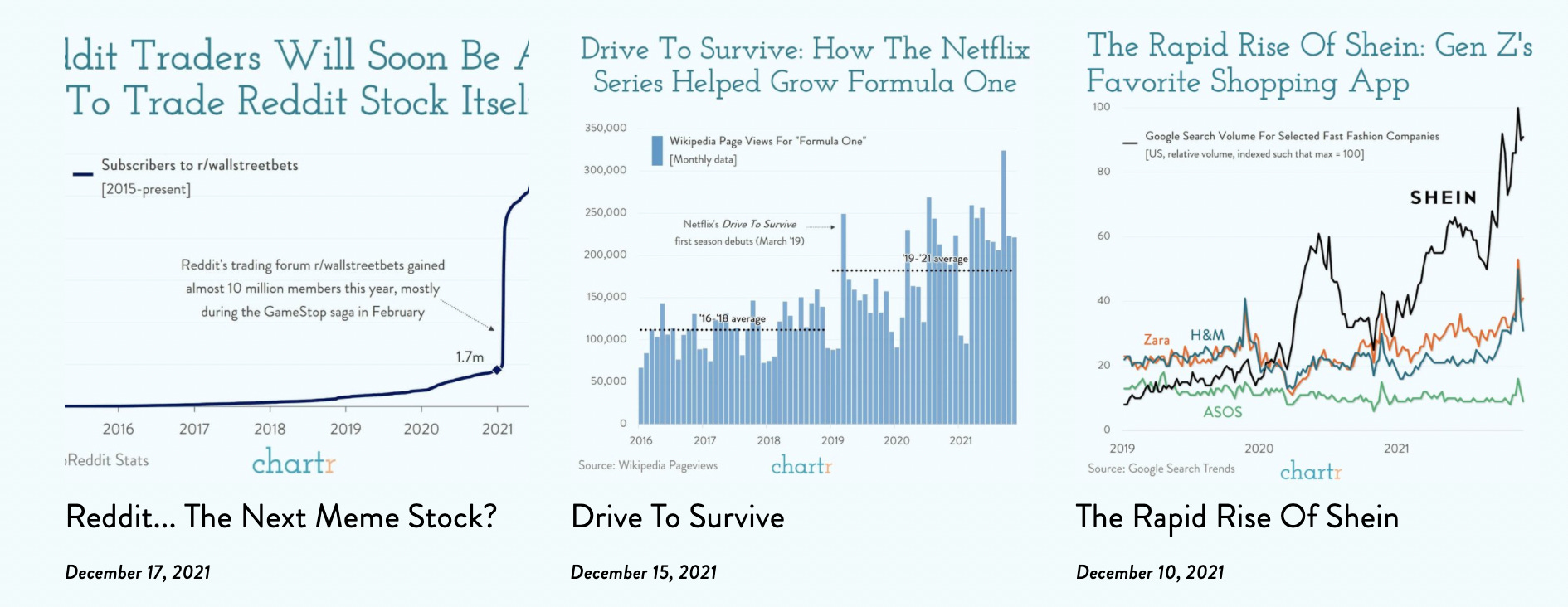 2.) Chartr. If you’re addicted to data (like me), this is your warning that Chartr’s newsletter is a massive enabler. It’s a masterful example of how to tell compelling and relevant stories through data - you’ll probably end up forwarding each edition to at least one other person. Chartr somehow manages to make almost every topic interesting, from the supply chain of coffee beans to the economics of Dollar Tree.