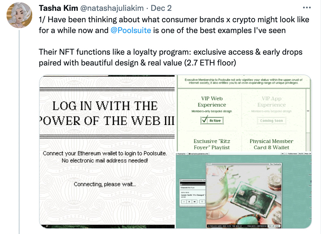 2.) Tasha Kim (@natashajuliakim). Tasha is an investor at Marcy Venture Partners, and her account features thoughtful and nuanced takes on all things consumer (both software and CPG). Lately she’s been exploring the intersection between crypto x community x culture - she’s a great resource if you’re curious about web3 and looking for an accessible and welcoming entry point. Definitely worth a follow!