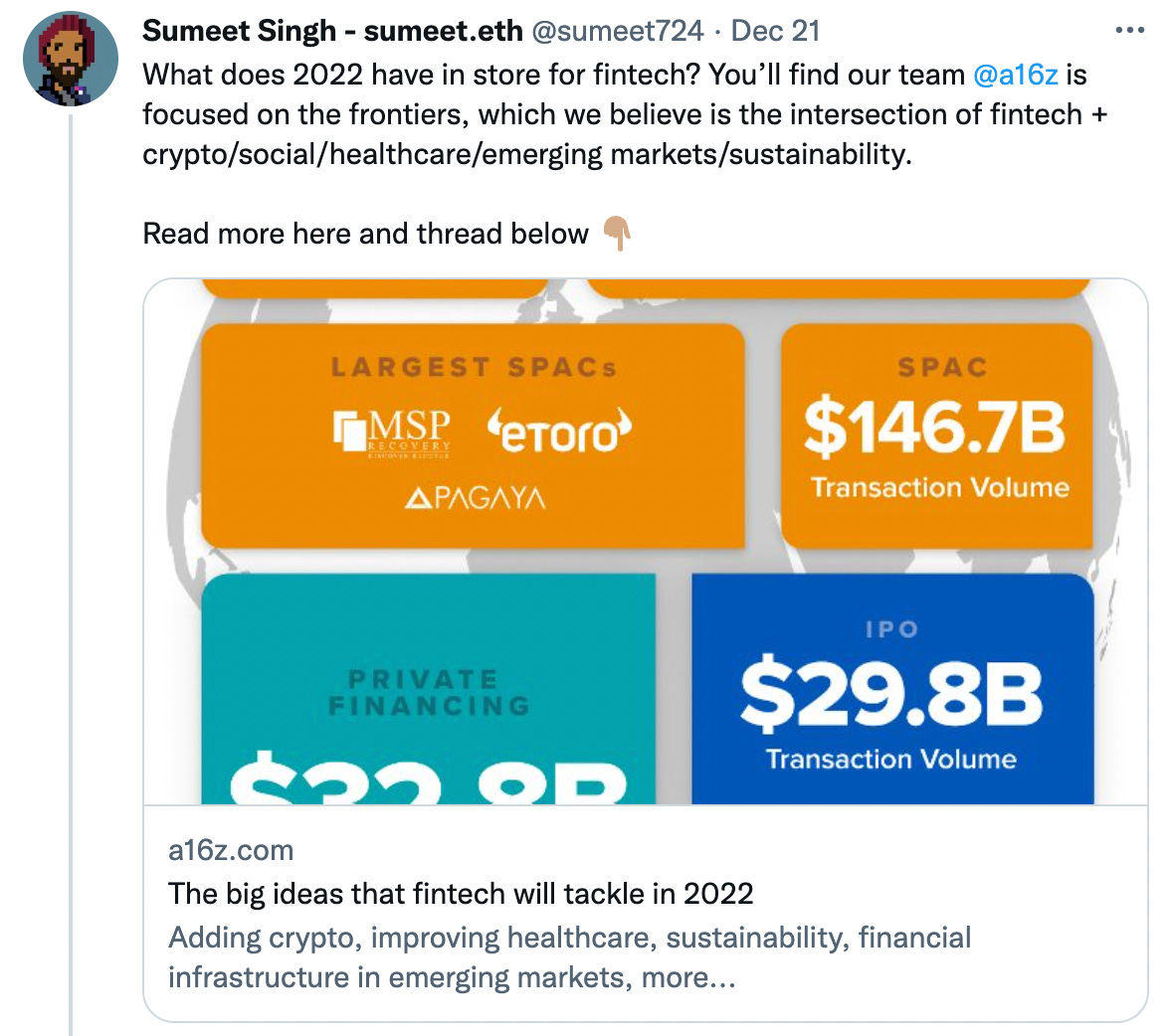 3.) Sumeet Singh (@sumeet724). Interested in the wide world of fintech, but not sure where to start? Sumeet is an excellent person to follow - he’s a partner at a16z focused on the intersection between fintech and other categories like consumer social and healthcare. I particularly loved his takes on financial services for “side hustlers” and how embedded fintech can increase marketplace liquidity.