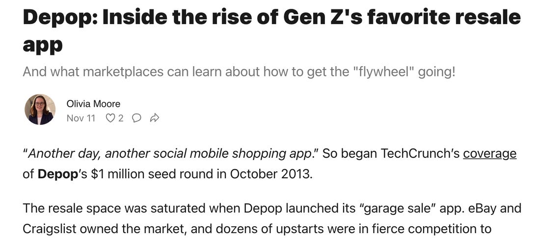 3.) Launched by Olivia Moore. Did you think I’d make it through without a shameless plug for Olivia’s newsletter? I’m admittedly biased but I think it’s her best work - she dives into the stories behind startups like Depop, Canva, and Coinbase, tracing critical early decisions that led to success. I love the contemporary sources she finds (e.g. Reddit or HackerNews posts, tweets) to make the stories come alive!