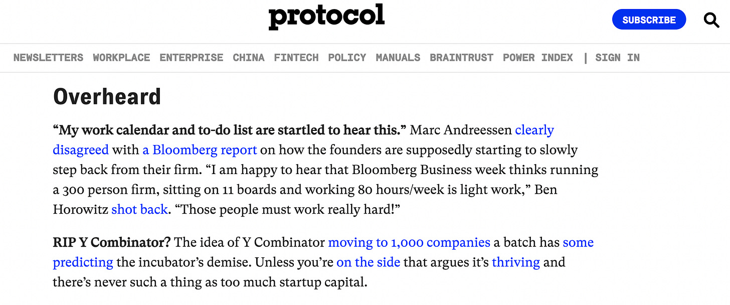 1.) Protocol Pipeline by Biz Carson. This can’t-miss newsletter recaps weekly happenings in startup & VC land - read it if you want to know what’s up! The idea isn’t new (which you know if you’re reading this 😂), but Protocol Pipeline proves you can differentiate with quality content. Biz concisely summarizes news, features and interviews, and flags the best tweets/ posts you may have missed.