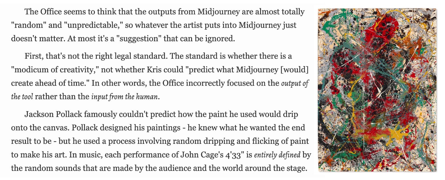 Kashtanova’s laywers believe that the USCO has a “factual misunderstanding” of how Midjourney works. The output is largely controlled by the prompt and iterations, and isn’t unpredictable. They argue that the images generated by Midjourney aren’t any more random than other types of art, like Jackson Pollock’s famous splatter paintings.
